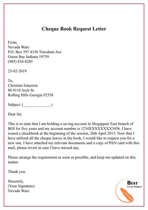 Cheque book request letter word format: Dear sir/madam, i, [your full name], am writing to request a new cheque book for my savings/current account number [account number] with your esteemed bank. Find out the details, format and tips to compose your application for a.